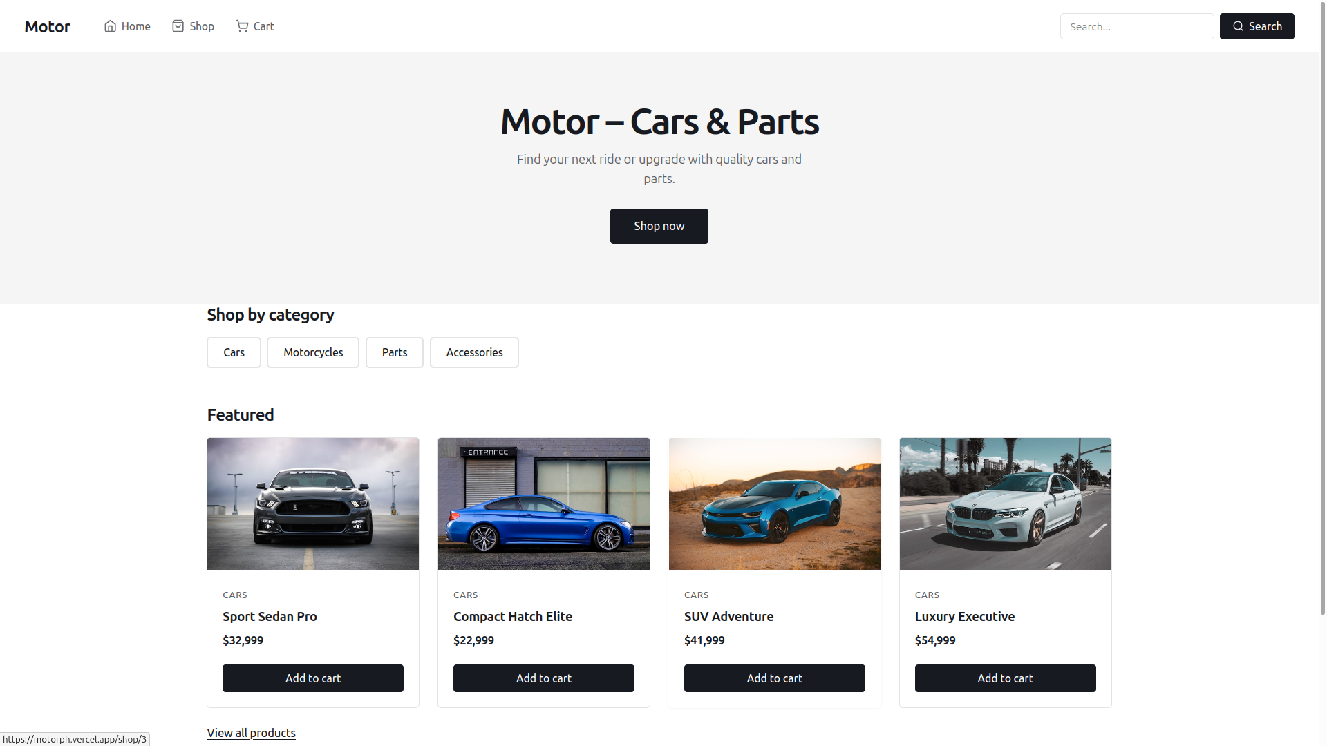 Car & parts e-commerce store — shop cars, motorcycles, parts, and accessories with featured listings and category browsing.